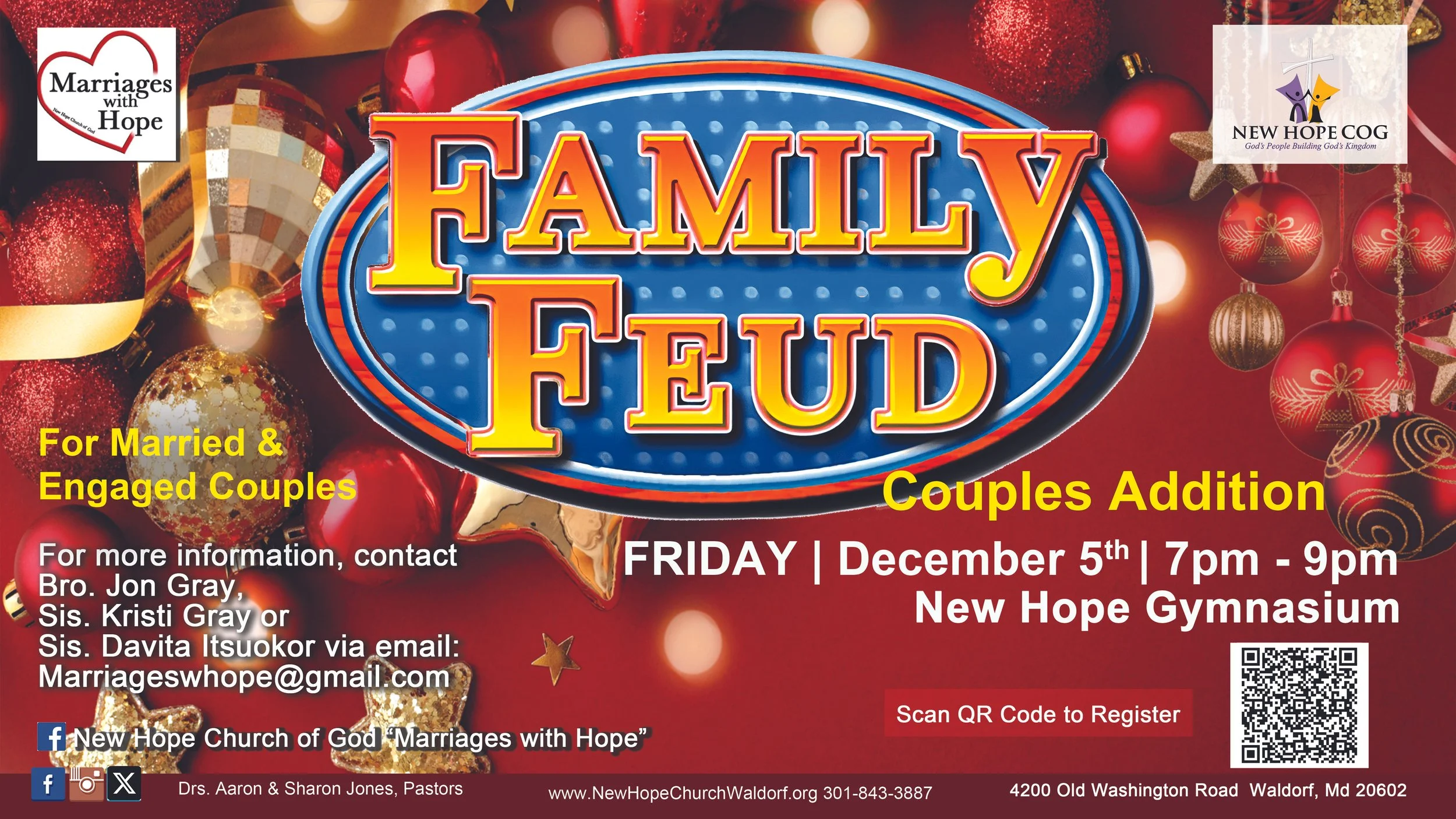 Marriages With Hope - Family Feud Couples Addition Friday, December 5, 2025 7:00 PM 9:00 PM 19:00 21:00 Google Calendar ICS Please scan the QR code on the flyer, or click the Registration Form button below to be redirected to register. Registration Form