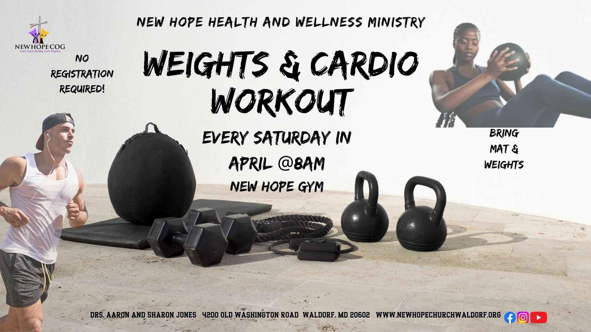 Health and Wellness Ministry Saturday, April 4, 2026 8:00 AM 08:00 Saturday, April 25, 2026 9:00 AM 09:00 Google Calendar ICS Weights & Cardio Workout Join us every Saturday starting April 4th for this free fitness class! Bring weights and and a mat!